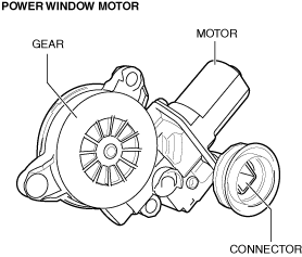 • When the power window motor receives an open signal from the power window main switch or power window subswitch, the motor rotates clockwise (RH)/counterclockwise (LH).