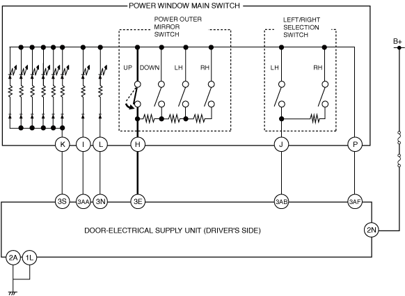 • The power outer mirror switch switches the contact point according to the switch operation. As a result, the circuit to the up-down/left-right adjustment motor is switched.