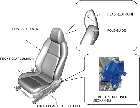• To reduce impact force applied to the head of the occupant in a vehicle collision, the rigidity of the pole guides has been improved and the head restraints have been set so that they tilt forward.