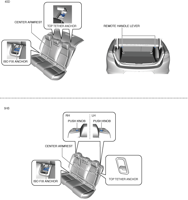 • A center armrest has been adopted on the rear seat.• The following two types of child restraint seat anchors have been adopted which enable securing of ISOFIX-applicable child restraint seats on the rear seat.