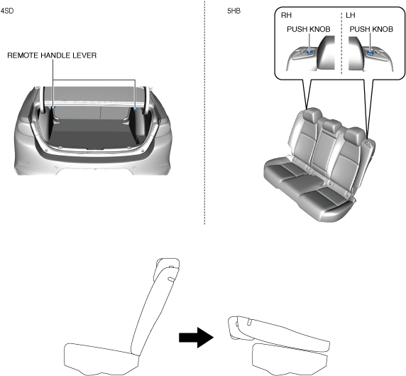 • The easy fold-down seats can be folded down by operating the push knobs or operating the remote handle lever to enlarge the cargo space.