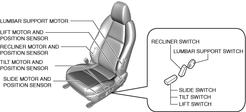 1. When the tilt switch of the power seat switch is operated up, the tilt switch on signal is input to the position memory control module.2. When the position memory control module receives the tilt switch on signal, power is supplied to the tilt motor.3. When current flows to the tilt motor and position sensor for tilt-up motion, the motor drives to set the position of the front part of the front seat cushion higher.