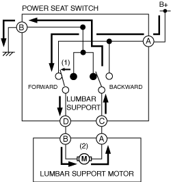 1. When the lumbar support switch is operated (1) forward, current from the battery flows (2) to the lumbar support motor.2. When current flows to the lumbar support motor for forward motion, the motor drives to set the bulge amount of the lumbar area of the front seat back.