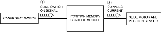 1. When the slide switch of the power seat switch is operated forward, the slide switch on signal is input to the position memory control module.2. When the position memory control module receives the slide switch on signal, power is supplied to the slide motor.3. When current flows to the slide motor and position sensor for forward motion, the motor drives to slide the front seat forward.