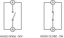 1.When the hood release lever is pulled, the hood opens and the latch lever is in an unlatched condition, and the hood latch switch turns off.