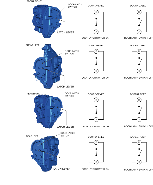 1.When the inner or outer handle is operated, the door opens, the latch lever is in an unlatched condition, and the door latch switch turns on.