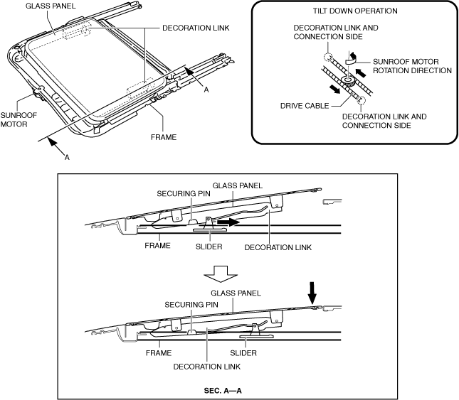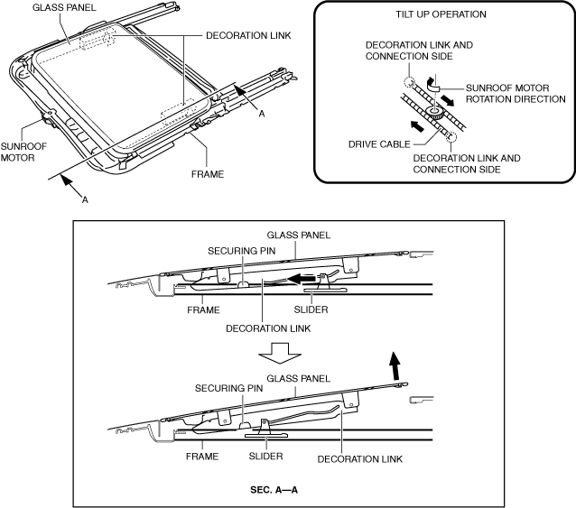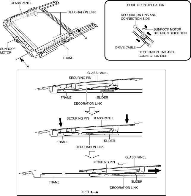 1. By rotating the drive gear in the sunroof motor, the drive cables operate in conjunction with the rotation.2. When the drive cables operate, the sliders move to the rear of the decoration link grooves, and the decoration links and glass panel lower.