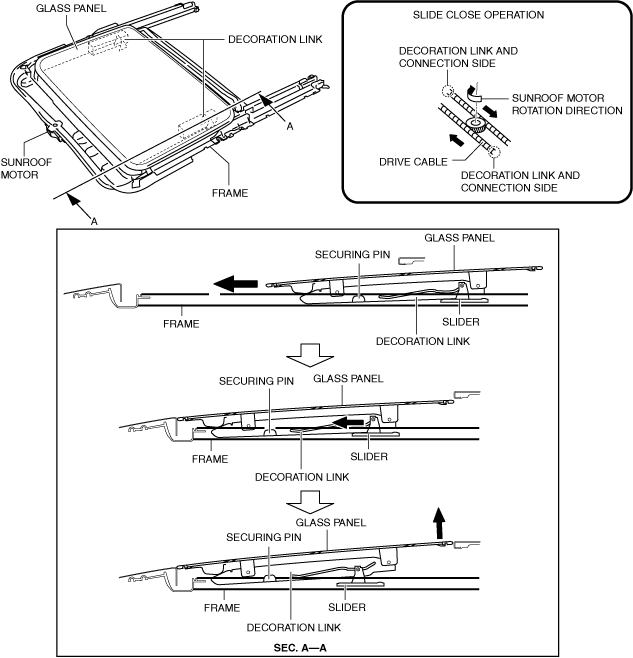 1. By rotating the drive gear in the sunroof motor, the drive cables operate in conjunction with the rotation.2. When the drive cables operate, the sliders move forward. Because the securing pins for the decoration links are in the frames and the rise in the decoration links is suppressed at this time, the slider cannot move in the decoration link grooves and the decoration links slide.3. When the decoration links slide to the close positions, the sliders move to the front of the decoration link grooves, and the decoration links and glass panel rise and close. Due to this, the securing pins are engaged with the frames.