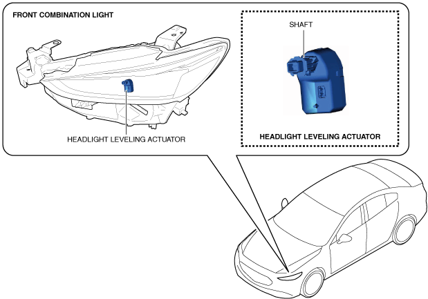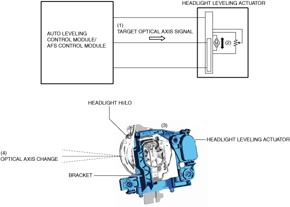 • The headlight leveling actuator drives the motor based on the target optical axis voltage, which is input from the auto leveling control module/AFS control module, to change the headlight LO optical axis.