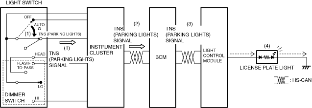 1.When the light switch is in the TNS position, the instrument cluster detects (1) a TNS signal.