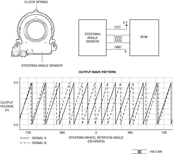 • The steering angle sensor detects the steering angle and sends it to the BCM as a steering angle (absolute steering angle) signal.