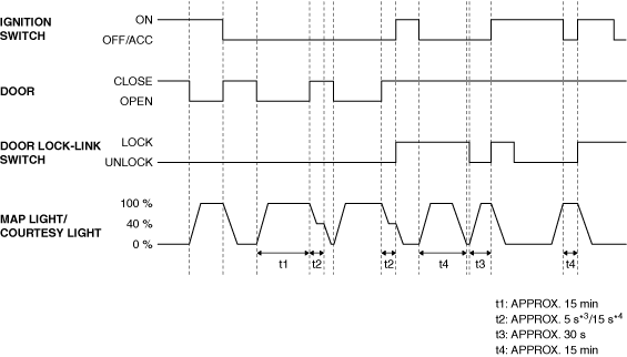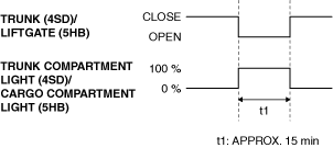 ― The ignition is switched ON (engine off or on).― After Trunk (4SD)/liftgate (5HB) is closed, and then opened again. (Trunk lid latch switch (4SD)/liftgate latch switch (5HB) off, then switch on)― Any door is opened/closed. (Any door latch switch on/off)― Door is locked/unlocked. (Door lock-link switch locked/unlocked)