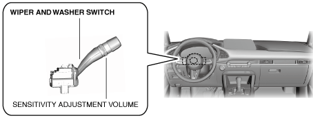 • While the auto wiper is operating, sensitivity of the rain sensor can be optionally adjusted by operating the sensitivity adjustment volume on the wiper and washer switch which changes the volume signal sent from the instrument cluster via the BCM. The rain sensor sensitivity can be adjusted from 1 (low sensitivity) to 5 (high sensitivity) according to conditions such as intensity of the rainfall.