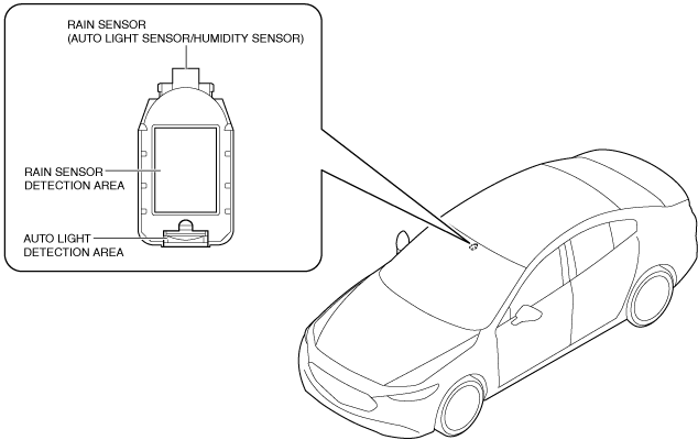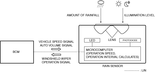 • The rain sensor detects the amount of rainfall by the rate of reflected infrared light emitted from the built-in LED.• The rain sensor calculates the windshield wiper operation signal based on the amount of detected rainfall.