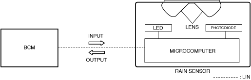 • When the ignition is switched ON (engine off or on), the rain sensor performs on-board diagnostics.• If a malfunction is detected in the rain sensor, the rain sensor sends an error signal to the BCM.• The BCM outputs DTCs based on error signals from the rain sensor.