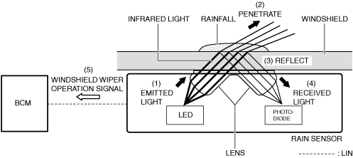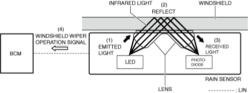 4.When the photodiode receives the light, the rain sensor calculates the reflection ratio at the microcomputer as the amount of rainfall, and it sends (4) the windshield wiper operation signal to the BCM by LIN communication.