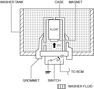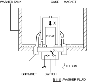 1.When washer fluid is increased in the washer tank, the float in the case rises (1).