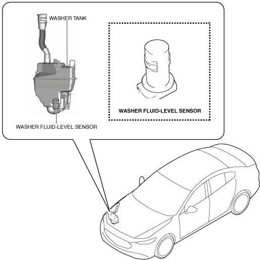 1.When the washer fluid in the washer tank decreases, the float in the case lowers (1).