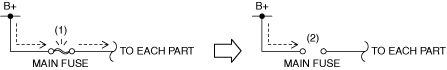 2.If the main fuse blows, electric current flowing to each part downstream of the main fuse is interrupted (2).