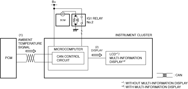 1.When the instrument cluster receives (1) an ambient temperature signal from the PCM while the ignition is switched ON (engine off or on), it displays (2) the ambient temperature in the LCD (without multi-information display)/multi-information display (with multi-information display) of the instrument cluster.