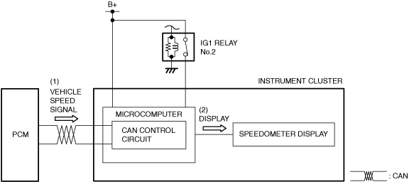 1.The instrument cluster displays (2) the current vehicle speed when it receives (1) a vehicle speed signal via CAN communication from the PCM with the ignition is switched ON (engine on).