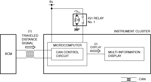 1.The instrument cluster receives the total traveled distance (odometer) data (1) from the BCM and the traveled distance (tripmeter) data (1) over a specific interval with the ignition switched ON (engine on).
