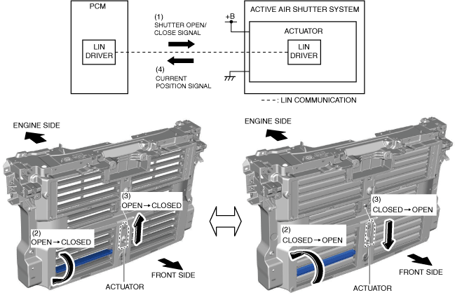 • The active air shutter opens/closes the shutter based on the open/close signal from the PCM. In addition, the active air shutter sends the current position of the shutter to the PCM.