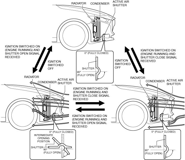 • When the ignition is switched ON (engine on) and a shutter open signal is received, the shutter opens to the intermediate opening position from the fully closed position or the fully open position to facilitate air flow to the radiator and condenser.
