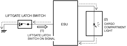 2.When the electrical supply unit (ESU) detects (1) the liftgate latch switch on signal, it turns the cargo compartment light on (2).