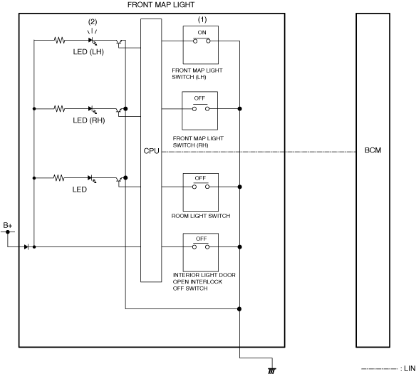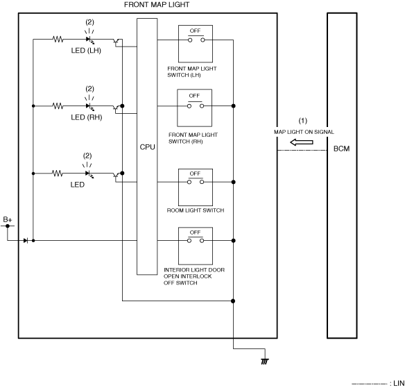 1. When any door is opened, the body control module (BCM) detects a door open signal.2. When the body control module (BCM) detects the door open signal, it sends (1) a front map light on request signal to the front map light via LIN communication.3. When the front map light receives the front map light on request signal, it turns the front map light on (2).