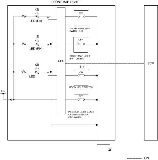 1. When the interior light switch turns on (1), the front map lights turn on (2).