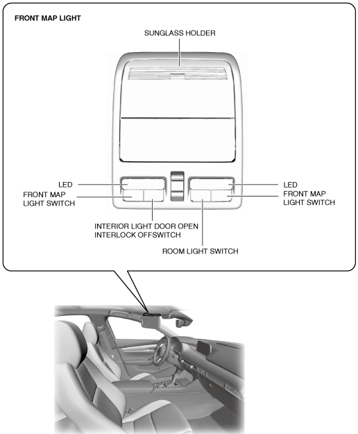 • When the interior light door open interlock switch turns off, the interior light control system controls the timing for turning the front map light on and off. For details, refer to the [INTERIOR LIGHT CONTROL SYSTEM].(See ROOM LIGHT CONTROL SYSTEM.)