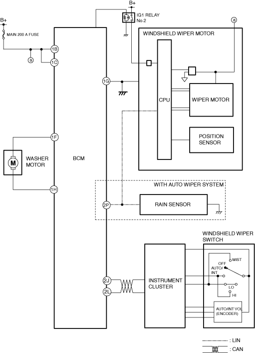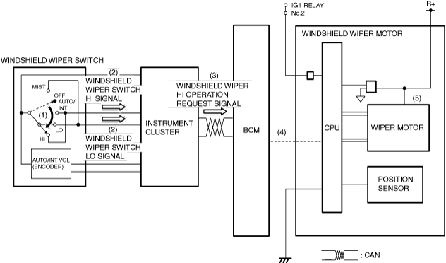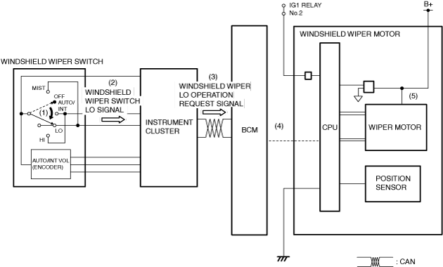 1.When the instrument cluster detects the windshield wiper switch LO signal, it sends (3) a windshield wiper LO operation request signal to the body control module (BCM) via CAN communication.