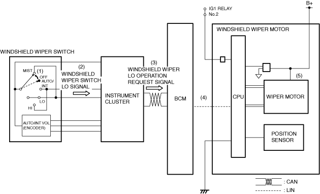 1. When the windshield wiper switch is moved up (MIST position) (1) with the ignition switched ON (engine off or on), The instrument cluster detects (2) a windshield wiper switch LO signal.2. When the instrument cluster detects a windshield wiper switch LO signal, the windshield wiper LO operation request signal is sent (3) to the body control module (BCM) using CAN communication.3. When the body control module (BCM) receives the windshield wiper LO operation request signal, it sends (4) a windshield wiper LO operation request signal to the windshield wiper motor using LIN communication.4. When the windshield wiper motor receives a windshield wiper LO operation request signal, it operates (5) the windshield wipers at low speed.