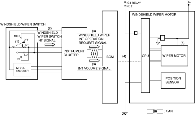 2.When the instrument cluster detects the windshield wiper switch INT signal, it sends (3) a windshield wiper INT operation request signal and INT volume signal to the body control module (BCM) via CAN communication.