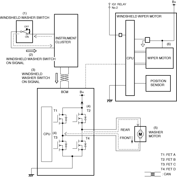 3.When the body control module (BCM) receives the windshield washer switch on signal, it turns FET B and FET C on (4).