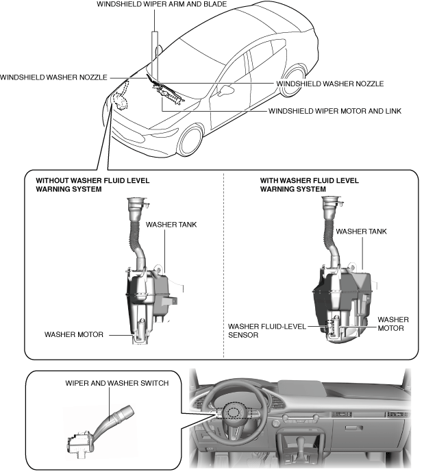― Continuous wiper (low/high) function― Auto-stop function― One-touch wiper function― Intermittent wiper function (without auto wiper system)― Auto wiper function (with auto wiper system)― Synchronized washer function