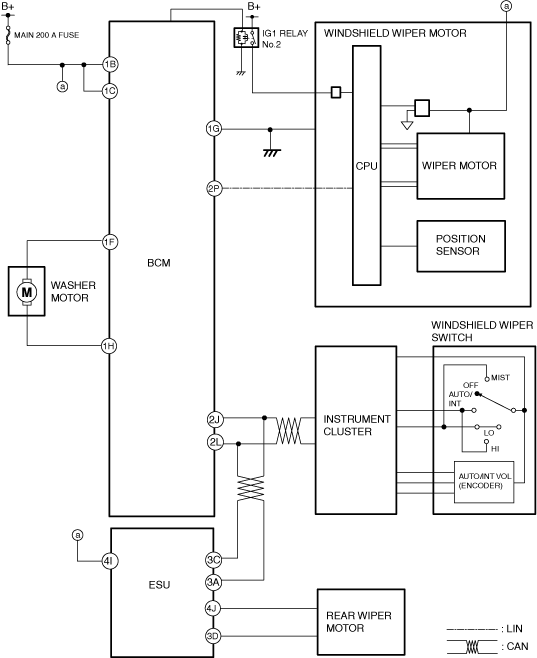 2.The instrument cluster sends (3) the rear wiper switch INT signal to the body control module (BCM) via CAN communication.