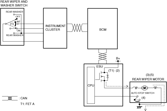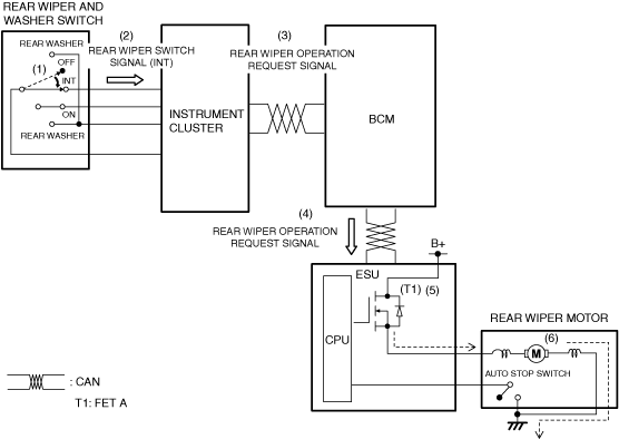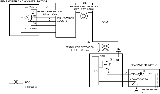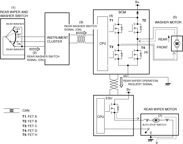 4.When the body control module (BCM) receives the rear washer switch on signal for a certain period of time, it sends (6) a rear wiper operation request signal to the electrical supply unit (ESU) via CAN communication.