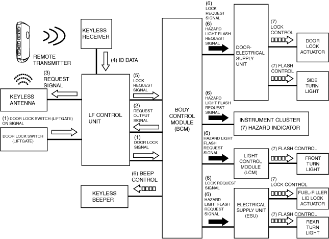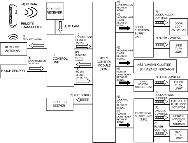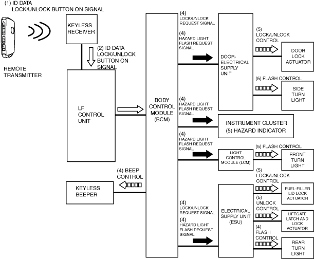 2.When the keyless receiver receives ID data and lock/unlock button on signal, it transmits the ID data and lock/unlock button on signal (2) to the LF control unit using SERIAL communication. The LF control unit verifies the key ID number and if the ID data matches, it sends a lock/unlock request signal (3) to the body control module (BCM) using SERIAL LFU (UART) communication.