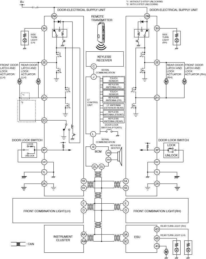 3.The body control module (BCM) sends a lock/unlock request signal (4) to the door-electrical supply unit (driver’s side) and door-electrical supply unit (passenger’s side) and electrical supply unit (ESU) using CAN communication.