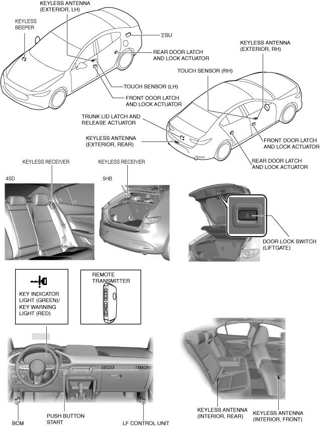 ― Auto re-lock function: After unlocking, if any door or the trunk lid is not opened and a period of time according to the personalization setting has elapsed, all doors are automatically locked.― Out-of-area (reception area) type auto lock function: After closing all doors, when the remote transmitter is brought out of the reception area of the keyless antenna, all doors are automatically locked.― Remote transmitter pause function: If all doors are locked with a transmitter left in the vehicle, the functions of the remote transmitter inside the vehicle are paused.― Remote transmitter left-in-vehicle prevention function: If the trunk lid is closed with a remote transmitter left in the vehicle, the trunk lid can be opened by pressing the trunk lid opener switch.― Alert function: If the system is operated incorrectly which results in a possible problem occurring, the system warns the user by using the indicator light, warning light, multi-information display, and buzzer in the instrument cluster, or by using the keyless beeper.