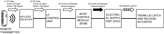 2.If the keyless receiver receives ID data and trunk lid open button on signal, it transmits the ID data and trunk lid open button on signal (2) to the LF control unit using SERIAL communication. The LF control unit verifies the key ID number and if the ID data matches, it sends a trunk lid release request signal (3) to the body control module (BCM) using SERIAL LFU (UART) communication.