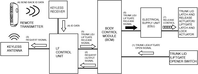 5.If the keyless receiver receives ID data, it transmits the received ID data (4) to the LF control unit using SERIAL communication. The LF control unit verifies the key ID number and if the ID data matches, it sends a trunk lid/liftgate release signal (5) to the body control module (BCM) using SERIAL LFU (UART) communication.