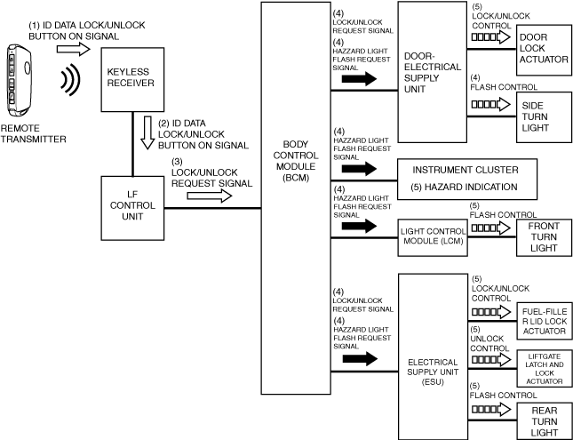6.At the same time as the door lock/unlock operation, it sends a hazard light flash request signal (4) to the instrument cluster, light control module (LCM), door-electrical supply unit (driver’s side), door-electrical supply unit (passenger’s side), and electrical supply unit (ESU) as a CAN signal.