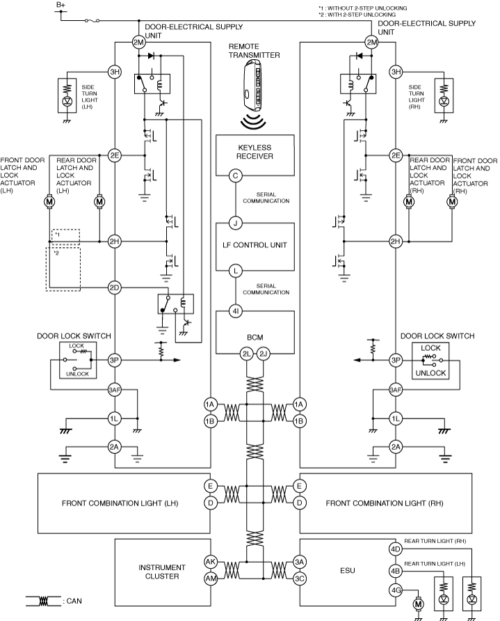 3.The body control module (BCM) sends a lock/unlock request signal (4) to the door-electrical supply unit (driver’s side), door-electrical supply unit (passenger’s side) and electrical supply unit (ESU) using CAN communication.