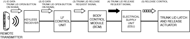1.When the trunk lid open button is pressed for approx. 0.5 sec, the remote transmitter transmits ID data and trunk lid open button on signal (1) to the keyless receiver by electromagnetic wave.