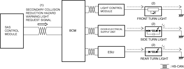 1. If the sophisticated airbag sensor (SAS) control module detects a collision with another vehicle, it outputs (1) a secondary collision reduction hazard warning light request signal to the BCM .2. The enter BCM flashes (2) the turn lights during a collision to caution surrounding vehicles when it detects a certain amount of impact.