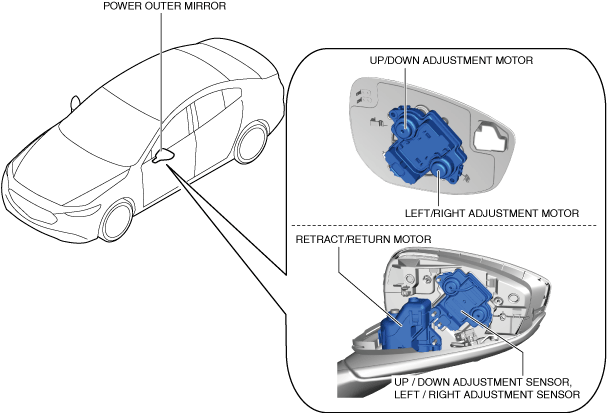 Up/down adjustment motor (Example: power outer mirror is operated downward)