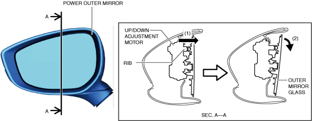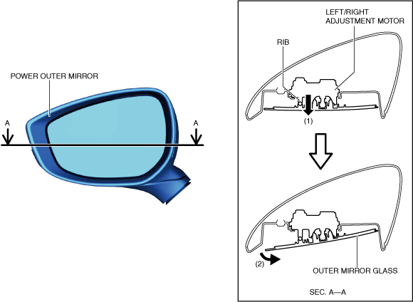 2.The rib pushes up the outer mirror glass and the outer mirror glass operates downward (2).